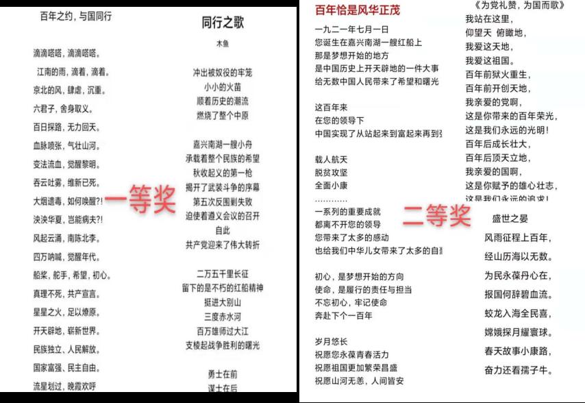 2021年是中国共产党成立100周年,也是“十四五”开局之年,为展示学生的青春风采,树立诗书礼乐之美!财贸学院学生党支部于2021年6月15日举办“为党写诗,与国同行”诗歌创作赛。财贸学院各期入党积极分子、发展对象、预备党员、党员积极参加。 本次活动的形式为:参赛人员以“为党写诗,与国同行”为主题,创作出符合主题的诗词、诗歌。其中林蕊愉、韩圳两位选手的《同行之歌》、《百年之约,与国同行》两首诗歌获得一等奖,吴晓瑜、张姿、黄秋敏三位选手获得二等奖,高安仪、李诗琦等五位同学获得三等奖。以上10位获奖同学通过诗歌描绘出建党一百周年间党的发展历程,展现了属于中国共产党的独特故事。 在本次活动中各位参赛选手都积极参加,充分发挥了自己的创作力,为党的一百周年华诞献上了一份特殊的礼物。最后希望各位同学能够不忘初心,牢记党史,进一步激发党组织的创造力、凝聚力、战斗力,为实现中华民族的伟大复兴而不懈奋斗。 |