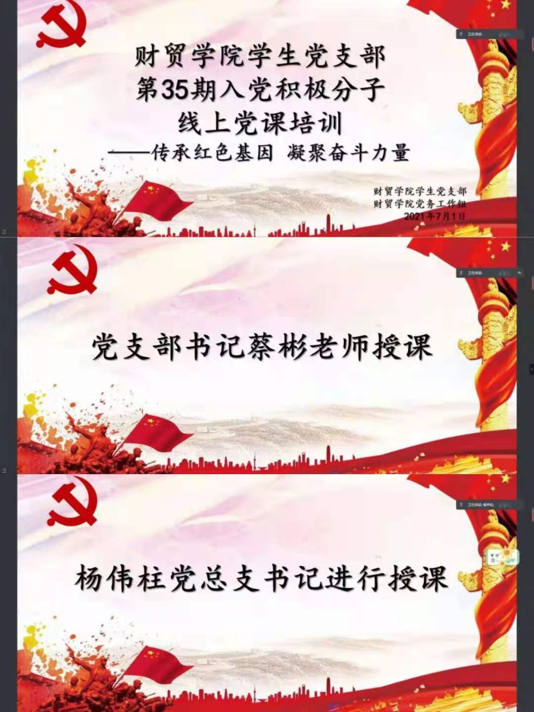 财贸学院学生党支部于2021年7月1日在腾讯会议对35期积极分子开展主题为“传承红色基因,凝聚奋发力量”的党课培训