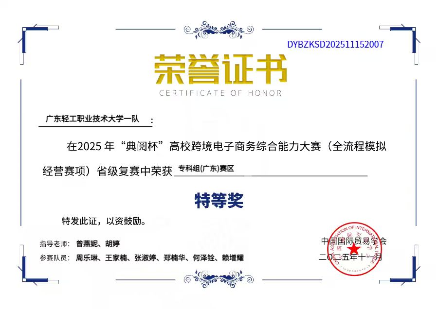 12月20日,2025年"典阅杯"全国高校跨境电商大赛圆满落下帷幕。我校财贸学院代表队的6名学生,在国贸教研室曾燕妮和胡婷两位老师的悉心指导下,勇夺省赛特等奖,并成功晋级全国总决赛。