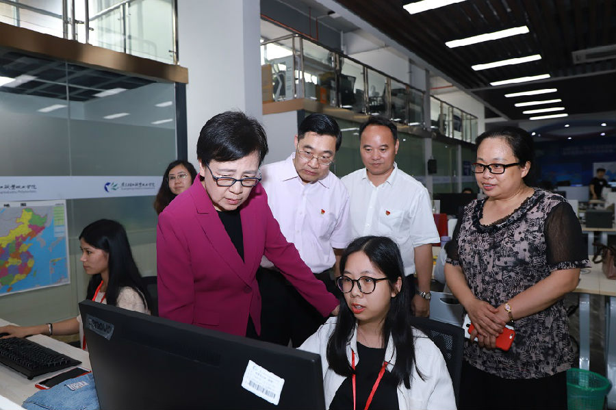 4月25日,教育部原副部长、中国职业技术教育学会会长鲁昕同志在学校领导陪同下视察了商贸产业学院,鲁会长观摩了电商直播和网店运营的企业真实项目教学。