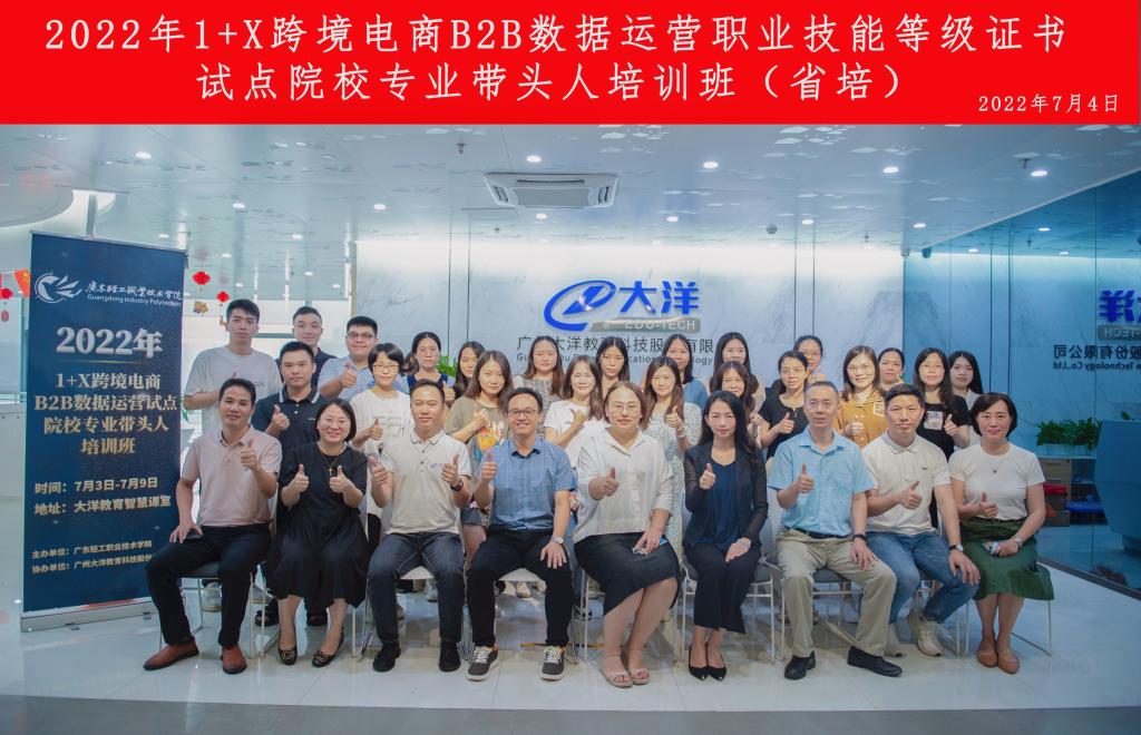 2022年7月4日,财贸学院2022年1+X跨境电商B2B数据运营职业技能等级证书试点院校专业带头人培训顺利开班。广东轻工职业技术学院财贸学院培训项目负责人肖威老师、广州大洋教育科技股份有限公司高级副总裁程燕娟、国贸教研室刘钧炎老师、班主任吴楚君老师,以及大洋教育产教融合事业部总监杨华智、教育事业部总监周黄宁等出席了开班典礼。
