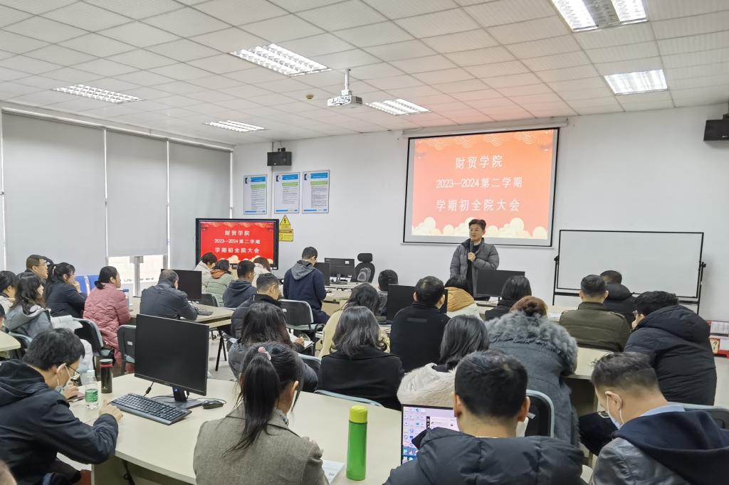 2024年2月27日上午,财贸学院2023-2024学年第二学期学期初全院大会在第二实训楼B403举行,学院领导班子及全体教职工参加了本次会议。会议由院长韩宝国主持。